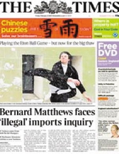 2月9日,英国各地被大雪覆盖,《泰晤士报》在当天头版报头的下方,用醒目的红色方框刊出“Will it雪or雨today?”,让英国读者猜到底哪个汉字才是“雪”,内页的长篇文章则讲述了汉字是如何从古老的象形图案演变成现代的汉字的,还让读者将“日、明、旦、从、田、门”等汉字与对应的英文单词联系起来。