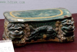 一件宋代北方窑生产的三彩划花枕,则将人们日常使用的枕头装饰得十分花巧。枕头大约20厘米长,10厘米高,略呈“凹”字形,在前面的两个角上有兽头的装饰,其余部分包括枕面都布满了花草等纹饰。