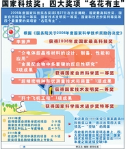 2006年度国家科技奖各奖项27日在北京揭晓,国家最高科技奖、国家自然科学奖一等奖、国家技术发明奖一等奖、国家科技进步奖特等奖等四个最重要的奖项皆“名花有主”。