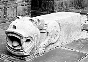 前、后室四隅中部嵌有石质兽首形圆雕,上部壁面有烟熏的痕迹,可能是摆放灯具的灯台。