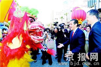 本报洛杉矶3日电(记者周文丽)美国当地时间2007年3月3日(北京时间3月4日)上午,在洛杉矶好莱坞星光大道的中国剧院前,洛杉矶市市长安东尼奥·维拉莱戈萨和中国驻洛杉矶总领事钟建华,提起饱蘸浓墨的笔,为狮子点睛。点了睛的狮子顿时如活了一般,摇头摆尾,欢跳腾跃,由此拉开了“北京风情舞动洛杉矶”的序幕。花车、高跷、秧歌、鼓乐、民间舞蹈、京剧及服饰脸谱展示、中国传统节日风俗展示等,加上现场不时出现的造型气球、卡通人物、彩色条幅和旗帜,星光大道变成了一条五彩竞宣的欢乐河流。从早上10时开始,得到消息的洛杉矶市民们陆续从四面八方汇集到星光大道上,感受一回中国人过年的欢乐和喜庆。