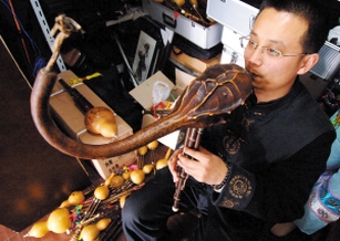 33岁的马苙钧,和别人谈起葫芦丝总是眉飞色舞的。每当人们从他家门前经过,都会听到优美的芦丝声,恍若到了少数民族地区。走进他的家,就像是进了一爿民族乐器店,桌上摆的、墙上挂的,地上一箱箱叠着的,全是葫芦丝。他从云南等地买回的各色葫芦丝和其他民乐器到底有多少,连他自己都说不清了。附近的居民都管他叫“葫芦痴”。