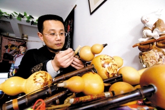 33岁的马苙钧,和别人谈起葫芦丝总是眉飞色舞的。每当人们从他家门前经过,都会听到优美的芦丝声,恍若到了少数民族地区。走进他的家,就像是进了一爿民族乐器店,桌上摆的、墙上挂的,地上一箱箱叠着的,全是葫芦丝。他从云南等地买回的各色葫芦丝和其他民乐器到底有多少,连他自己都说不清了。附近的居民都管他叫“葫芦痴”。