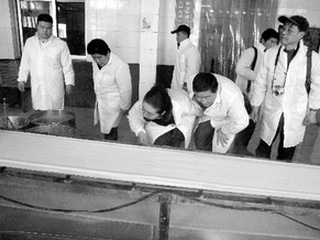 在工作人员的带领下,市民代表和本报记者一行由员工通道进入生产车间。首先进入更衣间。工作人员每天进入车间之前,在这里换工作服、戴口罩和穿长靴,然后趟过消毒池、洗手,进入操作岗位。在这里,我们被要求穿上白大褂,套上塑料鞋套,同工作人员一样,趟过二寸水深的消毒池进入车间,消毒池的水中放有84消毒液,用来清洗工作人员皮靴上带有的细菌。