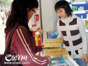 上图:药店导购员向记者推介“气血固本口服液”。杨英杰/摄