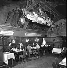 在酒馆创立之初,德国东部民间开始流传关于浮士德借用魔力遨游世界的传奇故事,并很快成为酒馆的话题。而这些话题开始并没有引起酒馆老板斯特莫的重视,后来他的儿子继任老板也没有在意这一传说,直到100年多年后,他的孙子当了酒馆的老板,才意识到传说中的浮士德已成为一个有趣的文化符号。为了装潢门面,提高酒馆的文化品位,他委托画家在酒馆的天花板和墙壁上绘制浮士德故事中的一些片断,同时又请雕塑家制作了一尊浮士德骑在橡木酒桶上的雕塑置于酒馆大厅。