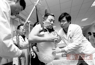 医生正在帮彭水林做接受腔。昨日,中国康复研究中心的专家开始为半截人彭水林制作下半身假肢。本报记者吴江摄