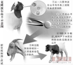 “波尔山羊体细胞克隆”科技攻关项目主持人刘海军博士介绍说,该项目在美国华裔克隆专家刘灵的帮助下于2000年正式启动,2003年科技人员从一只澳大利亚引进的原种波尔山羊母羊身上提取了耳朵皮肤细胞(这只原种波尔山羊2003年已死去),并从普通山羊的体内获得成熟卵子,剔除细胞核后,把波尔山羊耳细胞注入,构造一个克隆胚胎,然后将其移植到受体山羊的体内。经过了大大小小上百次实验后,克隆胚胎终于成功植入一只普通本地母山羊体内,并在155天孕期后,顺利产下了这只体重5.5千克的雌性小羊,获得了与原种波尔山羊遗传基因相同的复制品。