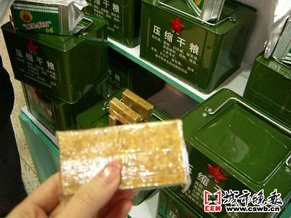 记者在现场看到,这种压缩饼干用玻璃纸包着,是长约10厘米、宽约5厘米、高约2厘米的立方体,就像一般卖的核桃酥。除了这种每块独立包装的压缩饼干,还有一种真空包装的,每袋里是八小块这样的压缩饼干。而旁边还有一个个方方正正的绿色军用铁盒,上面有一个红红的五角星,这种大包装里有十袋这种真空包装的饼干。