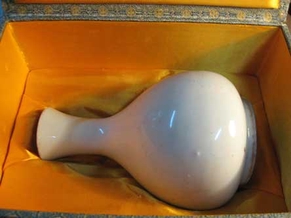 方秀钢先生说,这个玉壶春瓶是清代景德镇所烧制的,品相很完美,瓷胎相当薄,平均厚度只有几毫米,底部还有两环双圈形状的蓝色底款,这些都足以证明它是一件值得收藏的古瓷。
