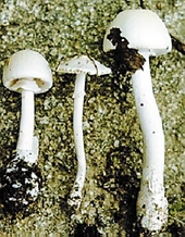 子实体中等大,纯白色。内部实心或松软,菌托肥厚近苞状或浅杯状,菌环生柄之上部。夏秋季分散生长在林地上。此蘑菇极毒。毒素为毒肽和毒伞肽。中毒症状主要以肝损害型为主,死亡率很高。