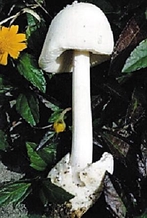 子实体中等大,纯白色。内部实心或松软,菌托肥厚近苞状或浅杯状,菌环生柄之上部。夏秋季分散生长在林地上。此蘑菇极毒。毒素为毒肽和毒伞肽。中毒症状主要以肝损害型为主,死亡率很高。