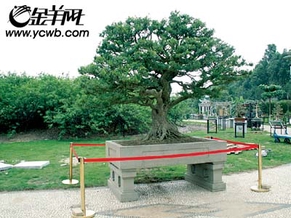 在中国盆景大观园展馆的门前,用红色锦带圈起了一盆高近两米的盆景,这就是大名鼎鼎的“黄杨皇”了,价值500万元。树主、大良盆景协会会长韩学年说起这棵黄杨皇显得特别高兴,这棵黄杨皇还有一段“古”呢。