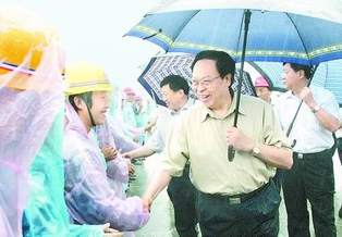 上午10时,大雨如幕。在郑石高速公路17号标段,徐光春认真听取了郑石高速公路建设项目公司总经理高建立的汇报,实地考察了17号标段、尤其是立交桥的规划和建设情况。风雨中,徐光春殷殷叮嘱有关负责同志,一定要创新工作思路,采取有效措施,在确保工程质量的前提下,加快工程进度,争创一流水平,努力实现“2007年底全面建成通车,打造示范工程,构建数字高速”的奋斗目标。徐光春与现场的施工人员一一握手,诚挚地向大家说:“同志们辛苦了,一定要保重身体,注意安全。”纷飞的大雨丝毫不减现场的热烈气氛。随后,徐光春还冒雨视察了部分建设路段,并来到公路工程指挥部,向长期奋战在施工一线的干部职工们颁发慰问品,致以亲切的问候。