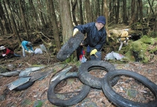 富士山位于东京近郊,堪称世界最美丽的山峰之一。从山脚的树林抬眼望去,只见圆锥形的山顶上覆盖着一层白雪。山下分布有5个湖泊。湖光山色,景色优美。但如果你低头看这片森林的地面,会看到另一番景象:到处都是垃圾。废弃的微波炉、建筑废料、残损的办公家具、生锈的冰箱,各类垃圾散落一地。