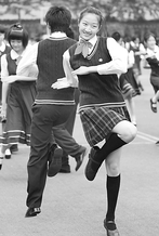 6月12日上午,北京市二龙路中学的塑胶操场上,一群着装整齐的中学生正在轻快活泼地跳舞,四个人一组,踏着鼓点旋转,不时地交换舞伴。整个操场都洋溢着青春气息。