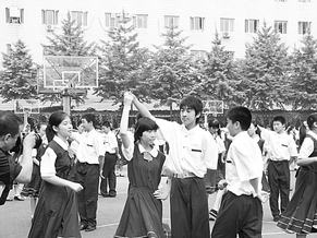 校园集体舞,是全班甚至全校的男孩女孩一起活动。让多名男生女生一齐交流,可以在最大程度上满足他们和异性交往的渴望,同时,还可营造一种健康向上的交往习惯。李玉兰摄
