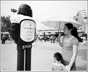 6月14日,在武汉汉口火车站广场,一个约两米高的“智能警察”引起了行人的注意。据了解,“智能警察”是一种网络视频监控系统,装有监控摄像头和红色报警按钮,工作人员可通过监视器看到报警人,及时与报警人进行语音交流,还可以根据需要对附近的人群进行远程广播疏导。新华社发