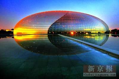 昨晚8时,部分灯光开启后,人工湖映衬下的国家大剧院。本报记者赵亢摄
