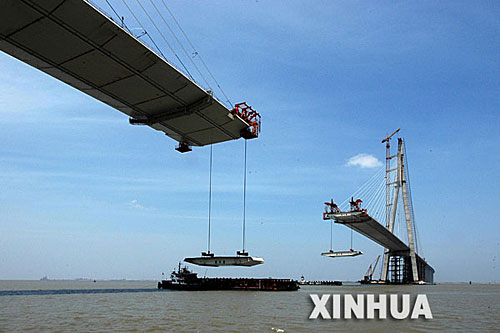 资料图片:4月23日,苏通大桥钢箱梁正在吊装就位。新华社发