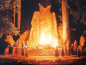 1989年,《间谍杂志》记者菲利普·韦斯报道说,他亲眼看见会员们举行神秘仪式的场面。会员们会脱掉西装,换上一套红色长袍,头上还罩着长兜帽,手持火把绕着俱乐部那巨大的猫头鹰图腾开始转圈,并模仿古代的敬拜仪式向摩洛献活婴儿火祭及喝生人血。(注:摩洛神,是古代腓尼基人所崇拜的神之一,信徒常常要将儿童活活烧死,以向其祭祀。因此,摩洛神也被视为极为可怕的异教神,也被引申为极为可怕、恐怖的事物。)这种神秘篝火仪式至今已有125年历史,它象征着丛林聚会的神秘以及在丛林的两周内每个人享受无上自由的权力。