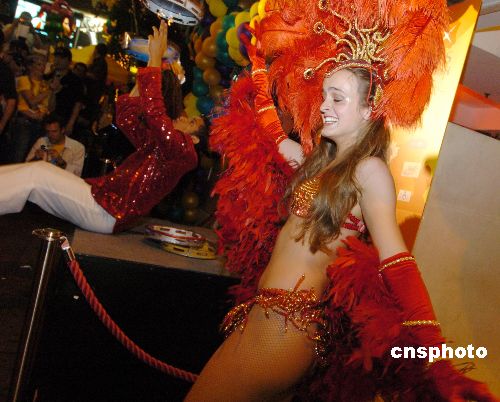 香港兰桂坊酒吧街人潮涌动,各色人种汇入小小的著名的街道体验嘉年华的热闹。图中兰桂坊街头酒吧热舞女郎精采表演吸引游人观看。中新社发 王丽南 摄