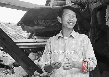 【经历】一阵地动山摇之后,“嗡”的一声巨响,徐光荣卧室侧边的土基墙倒塌下来,随即,木头楼板折断成两截,垮塌下来,就落在夫妇两人的床边,幸好没有砸到人身上。两人被困在房里,徐光荣的儿子赶快从外面搬开拦在门边的一个木柜子,艰难地把他们拉了出来。站在房前,看着眼前的惨状,徐光荣和妻子禁不住潸然泪下。这间房子是夫妇俩辛苦大半辈子积攒下的最大财富,他们还记得,盖房子的时候,大儿子还不满周岁,是两人背着孩子,起早摸黑建起来的。多年的心血,顷刻毁于一旦,徐光荣感觉心都碎了,妻子更是伤心得两天没吃一颗饭。