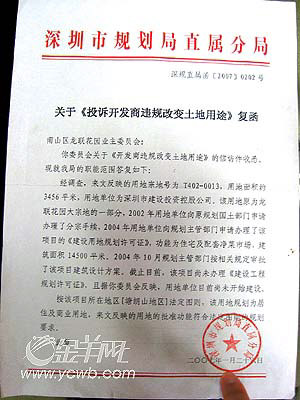 对于龙联花园业主反映的情况,记者多次联系了深圳市规划局、深圳市国土和房产管理局等有关部门的相关人士。昨日获得答复称:据了解,是1995年分宗,但记者仍未见到有关批文。