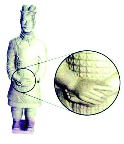 科特罗认为,将军俑的手交叉,表示10,但一个食指抬开,10减去1等于9。