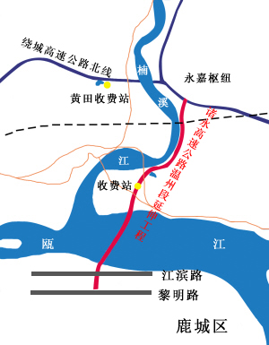 诸永高速公路温州段延伸工程起点位于绕城高速永嘉枢纽(瓯北镇北岙村),沿楠溪江东侧向南,上跨新、老104国道,进入永嘉三江片区,在新、老104国道之间设置收费站,然后以桥梁形式跨越瓯江到达南岸温州市区,沿灰桥浦东侧,终于江滨中路,与民航路相接。路线全长约7.68公里(见左示意图)。沿线设互通立交3处,分别是:起点永嘉枢纽互通、三江互通、终点江滨路的互通。
