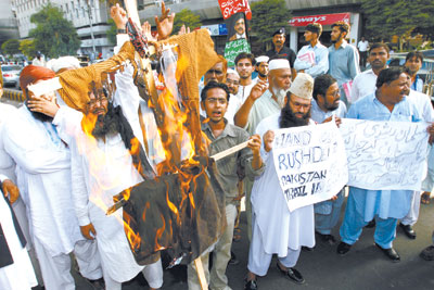 6月19日,巴基斯坦抗议者焚烧萨尔曼·拉什迪的塑像,以抗议英国政府册封拉什迪为爵士。