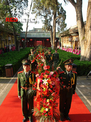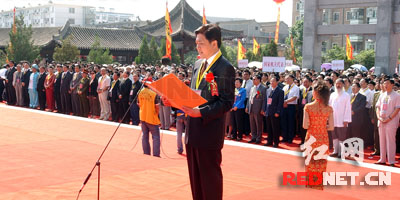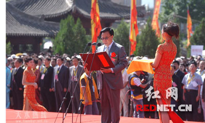 在龙旗飘扬,丝弦悠扬声中,全国政协副主席郝建秀宣布:公祭中华人文始祖伏羲大典仪式开始,甘肃省委书记、甘肃省人大常委会主任陆浩代表全国人大常委会副委员长李铁映诵读颂伏羲辞。