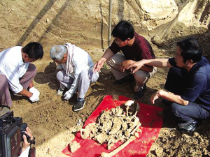 今年6月初,等张之洞墓地附近的小麦收割完毕,邢家训等人雇来挖土机,来到现场,按照张执信所指的大概位置开始挖掘寻找。9日早晨,人们终于发现了两具遗骨(如图)。遗骨并列而卧,头北面上,男左女右,与张执信所说相吻合。为了验证其真实性,张之洞研究会工作人员仔细测量了遗骨的身高、手指长度等。经查证文献档案,与历史记载相吻合。又因张之洞墓至今附近方圆几十米内没有其他坟墓,研究会基本肯定是张之洞遗骨。张氏族人张厚谦亲自动手敬骨,县民政局订做了棺木。目前,张之洞和夫人遗骨被护送安置在烈士陵园,将待进一步科学鉴定后,祭奠重葬。 中 新
