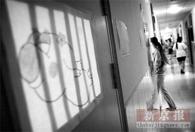 昨日,“向日葵”治疗社区女区楼道的一扇窗户上贴着一只戴着小花,长着翅膀飞翔的卡通小猪。本报记者 赵亢摄