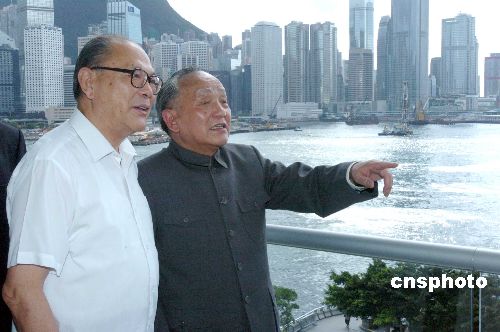 6月25日,为庆祝香港回归十周年盛事,香港客属各界庆祝香港特区成立十周年庆典活动常设委举行《香港客属各界庆祝香港特区成立十周年庆典晚会》---《香江颂》新闻发布会。内地知名演员潘玉民(饰演邓小平)、张云立(饰演叶剑英) 出席记者会后,在香港会展中心眺望维港两岸。中新社发 邓庆乐 摄