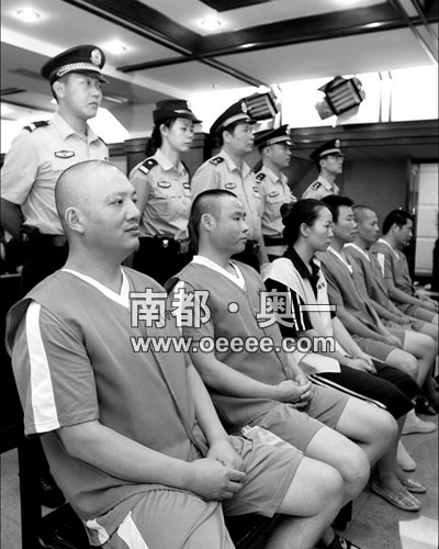 刘招华(前左一)在受审时,脸上挂着招牌式的微笑。这名名噪一时的毒枭,曾经是一名法警。 罗伟雄 摄