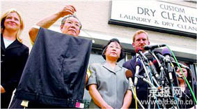 韩国人郑金南一家三口原在华盛顿市开了一家社区干洗店。2005年5月,他们收到哥伦比亚特区法官罗伊·皮尔森送来的一套栗色夹蓝纹套装。两天后皮尔森来到店里取衣服时,说套装的裤子不见了,为此要求郑家按套装购买价支付1000多美元赔偿金。郑家一星期后称找到这条裤子,他们想把裤子还给皮尔森,以免付赔偿金。但皮尔森不承认那条炭灰色裤子是他的,进而向法院提起诉讼。