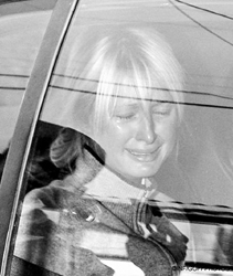 图为6月8日被戴上手铐的希尔顿痛哭流涕地被押回监狱服刑。