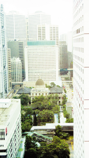 挤在中环林立的高楼中间,香港立法会大楼显得很孤寂。记者从远东国际金融中心23楼一个写字间望过去,立法会大楼是一座有着尖顶阁楼的穹顶建筑,整体方正,几分像北京的四合院。