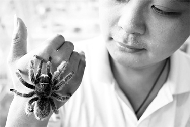 蜘蛛适应能力强,很容易成活,特别适合“懒惰”的宠物爱好者。购买者大多是年轻人,其中四成是女性,基本上都是喜欢标新立异的“80后”,也有一些白领,而年纪最小的饲养者只有十三四岁。近来,买蜘蛛的人越来越多,夏先生的小店一个月最多可以卖出四五十只。