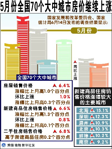 图表:5月份全国70个大中城市房价继续上涨 广西北海房价涨幅15.1% 列全国第一 新华社发