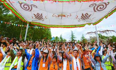 抵步典礼举办地拉萨市龙王潭公园位于布达拉宫东北侧,下午3点半不到,这里就聚满了身穿节日盛装的数千名藏民。伴随着藏族民歌《扎西雪巴》响彻云霄的歌声和《牦牛舞》热烈欢快的舞步,以拉萨市副市长次仁旺久为首的藏族群众向志愿者献上了洁白的哈达和香醇的青稞酒。