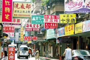 同一方向、密密麻麻的店铺招牌透露着香港风情,繁体字用得很多,更有不少餐馆用醒目的大字注明“港厨掌勺”。这里的治安员也与别处不同,他们衣着整齐,肩上斜挎着黑色背带,黑腰带上别着对讲机,像香港警察一样。