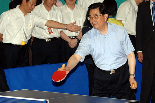 昨天下午,胡锦涛一行来到香港体育学院,视察香港精英运动员训练基地。颇具运动天赋的胡锦涛在视察期间更是展现亲民一面,下场与曾获得全国性少年比赛金牌的赵颂熙小朋友切磋球技。赵颂熙坦言刚开始的时候还是有点“手下留情”,但是后来面对胡主席“凶狠”的扣杀,小赵也不得不使出浑身解数与之一拼高下,不让胡主席的扣杀轻易得手。胡锦涛的高超球技令这位小冠军给出80分的高分评判,“赛后”胡锦涛还为赵颂熙在球拍上签名留念,令小朋友格外兴奋。这场难分伯仲的忘年友谊赛让在场的记者感到兴奋,每每双方打到精彩之时引发阵阵喝彩。有香港记者表示,没想到胡锦涛乒乓球打得这么好。