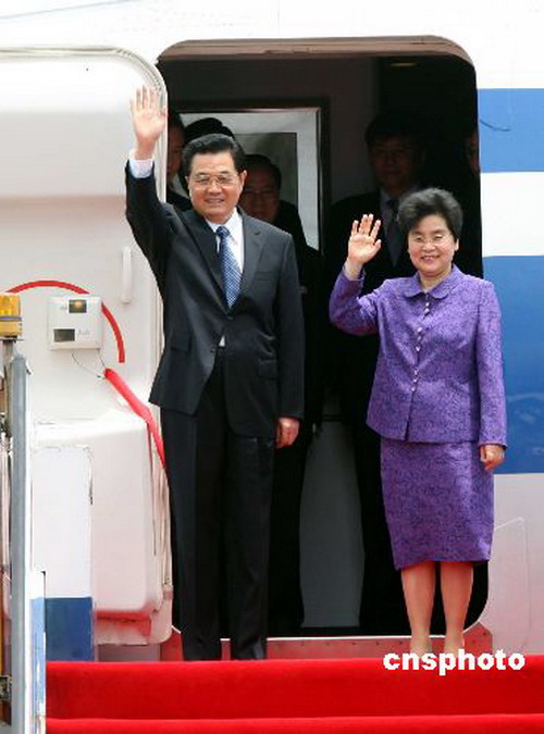 胡锦涛与夫人在机场向迎接人群挥手致意