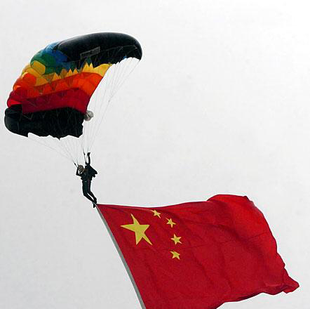 10时30分,中国人民解放军八一跳伞队为香港回归十周年献上份一份特殊的礼物――“雄风翱翔庆回归”跳伞表演在跑马场精彩上演。八一跳伞队在香港的首次亮相,吸引了近万名香港市民和游客前来观看。表演中的“紫荆盛开”,10名跳伞运动员从2200米的空中,以50-70米/秒速度坠落,组成五星图形,释放出彩烟分两层向五个方向冲开,在空中形成一朵美丽的紫荆花,现场气氛达到顶点。