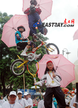 东方网特派记者姚琳琳7月1日香港报道:香港回归祖国10年整,为了庆祝这个喜庆的日子,香港近期共策划组织了800多项异采纷呈的活动。今天,随着5000人大巡游、解放军八一队跳伞表演、大熊猫园开园等将香港庆祝回归活动推向了高潮。