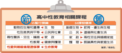 对于“性爱与婚姻伦理”这门新的选修课程,岛内高中生意见分歧,就算认为有必要特别开课,也希望能少谈理论,多教保护自己的实用信息,且最好男女分开上课避免尴尬;也有学生说,要搜寻性爱相关信息其实很容易,而且高中课程很繁重,“千万不要再增加我们的负担啊”。(周先)