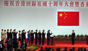 胡锦涛说,10年前的今天,中英两国政府举行了香港交接仪式,中国政府庄严宣告对香港恢复行使主权,中华人民共和国香港特别行政区成立。香港回归祖国,实现了包括广大香港同胞在内的全国各族人民的百年夙愿,是彪炳中华民族史册的千秋功业。