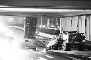 昨日凌晨2时许,几十名路政、清障救援和交警人员正在现场勘察。此时,一只长约4米、宽2米的空车斗仍卡在限高3米的马甸桥下,前方的驾驶室倒塌,门上面写有“河北迁安市”字样,里面的方向盘扭曲。路面上,碎裂的玻璃、零件与汽油混杂在一起,其中包括几条带有血迹的绷带。